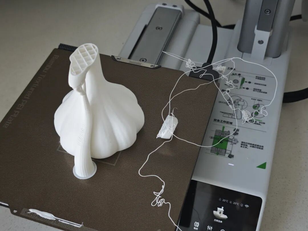 但这台机器也没有传言中完美。它会出BUG,比如因为打印中途线材突然卡住,机器打出了一团乱麻;打印耗时漫长,一把“萝卜刀”要3个小时,一条20厘米长、有可活动关节的“中国龙”,需要8个小时;因为打印过程气味刺鼻且释放细微颗粒,和打印机待在同一空间不久就会感到不适,只能放在通风环境中。