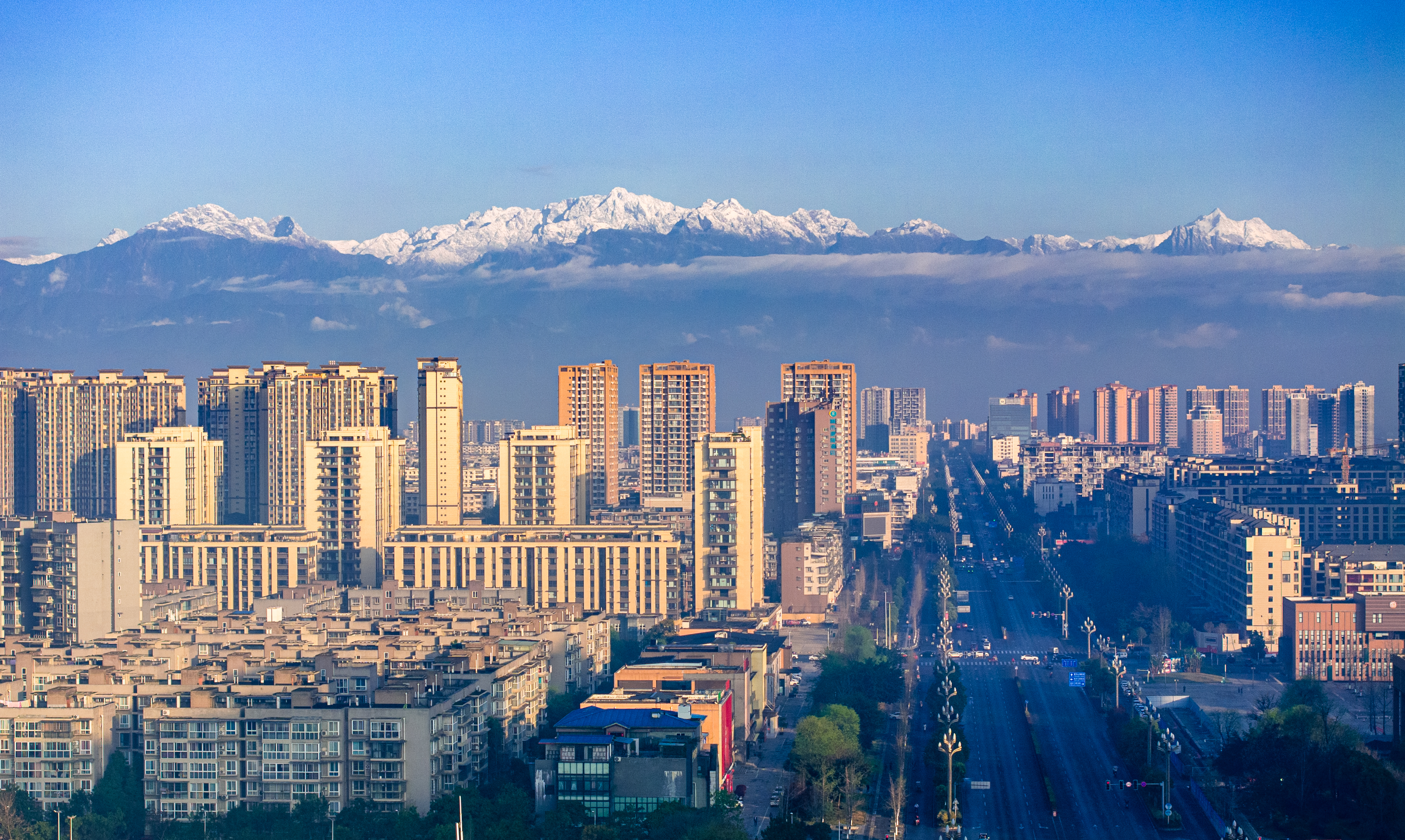 天气好时,从德阳市区往西远眺,远处海拔4989米的龙门山脉最高峰——狮子王峰,阳光正洒向山顶,将积雪照得金黄。